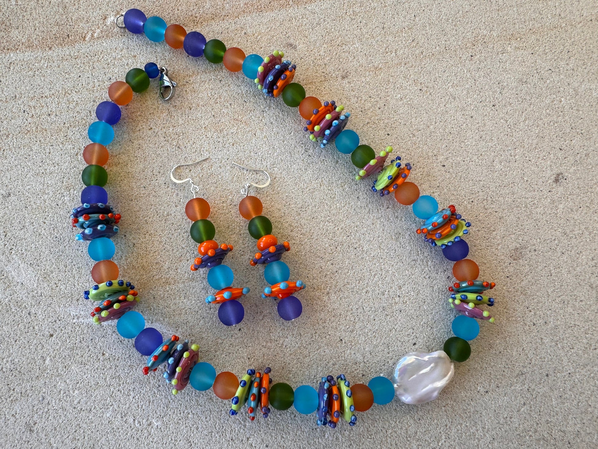 Material: Handmade Artisan Lampwork Glass Spotted Circle Beads + Frosted GlassBeads + Baroque Pearl