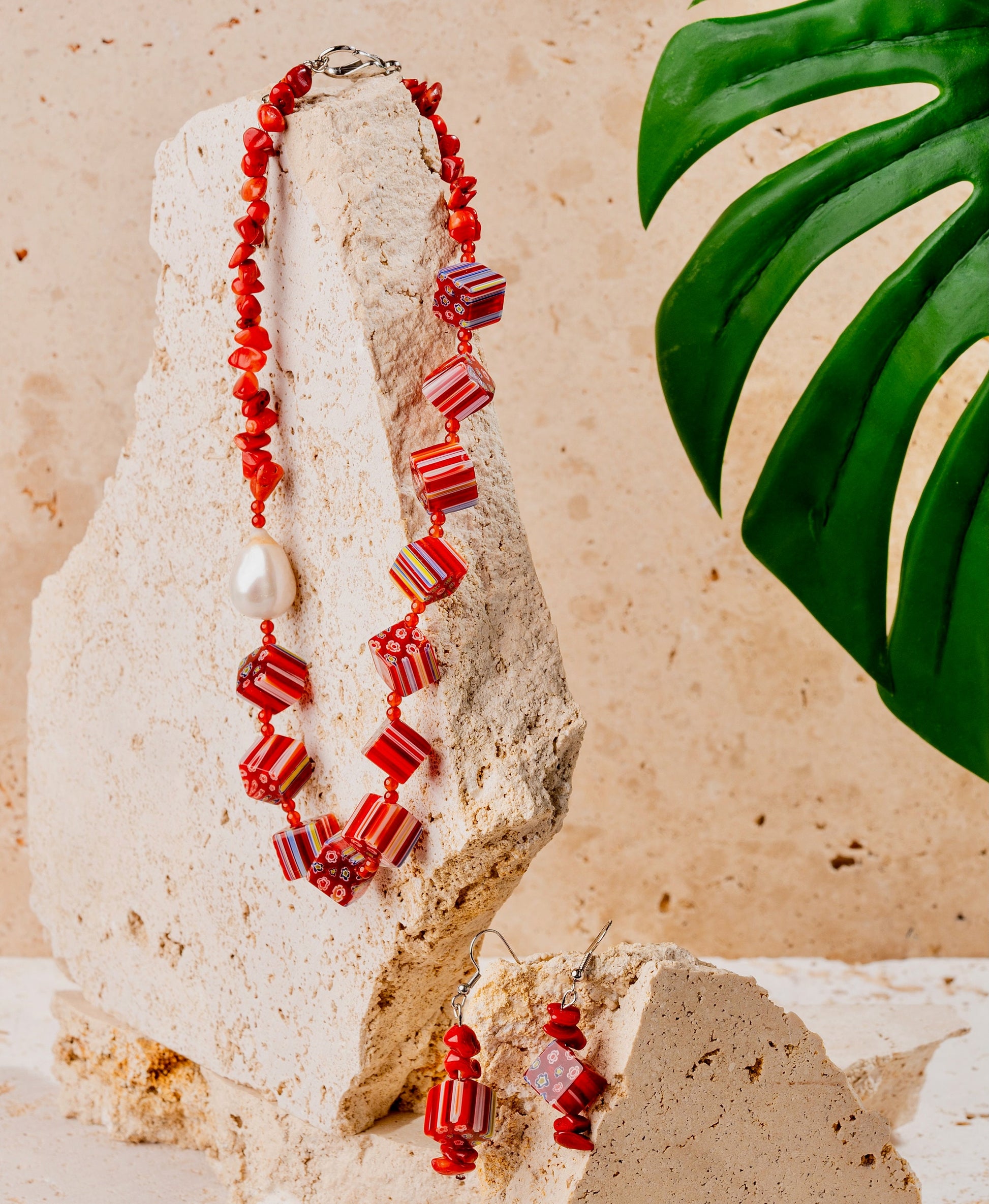 Millefiori Italian Glass Beads + Red Jasper + Freshwater Baroque Pearl Gemstone Beaded Fashion Jewellery Set