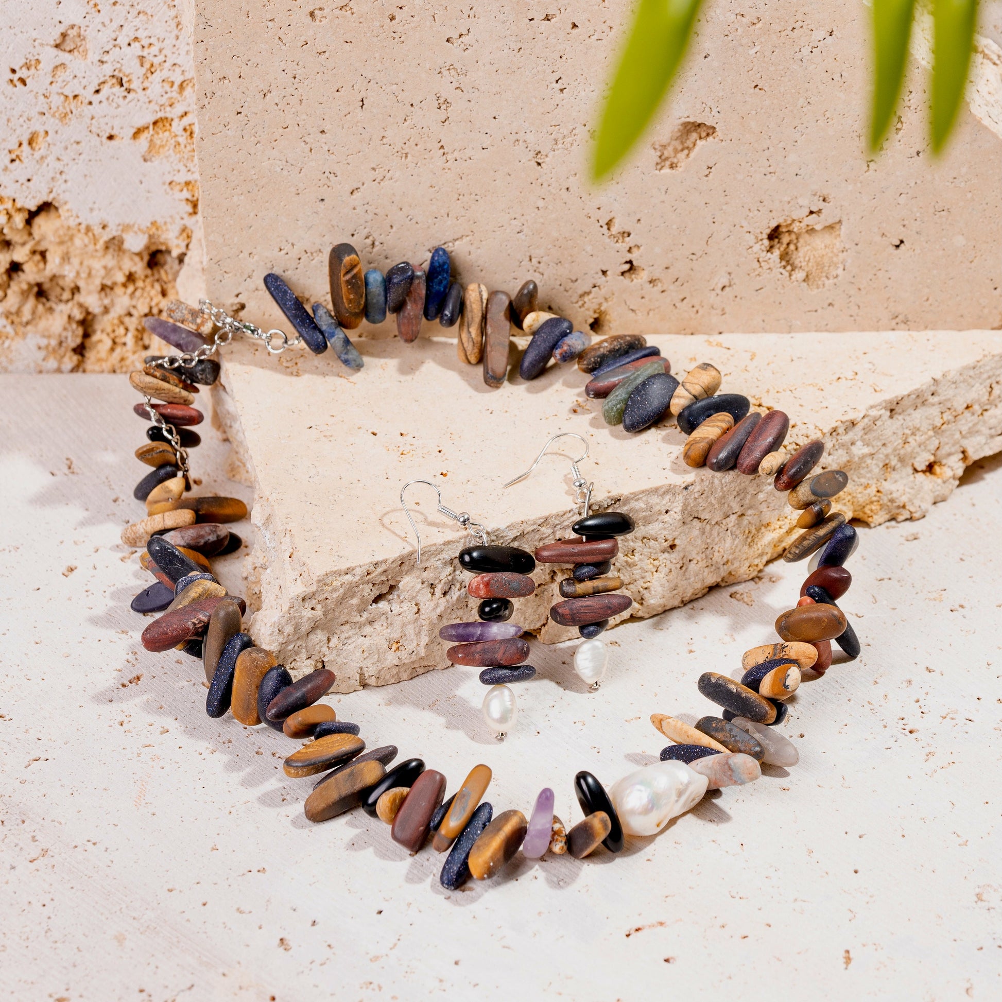 Stone Tooth Stick Dagger Beads Necklace and Earrings, Baroque Pearl Beaded Necklace Set, Beaded Dangle Earrings, Romantic Jewellery Gift